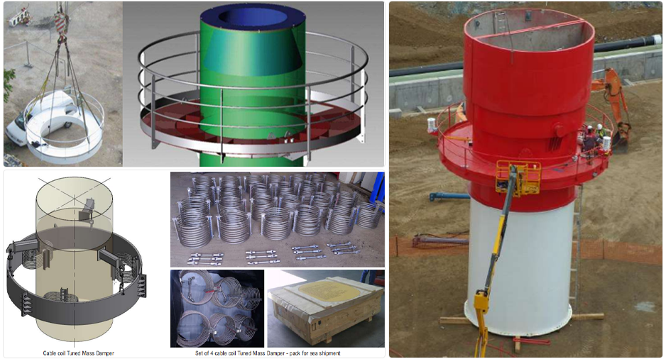 工业阻尼器是公司的独立产品,该产品在高耸构筑物的应用可以极大的改善结构体系涡旋振动造成的疲劳破坏,降低结构材料用量,保证结构安全,在钢烟囱、塔器等高耸建筑物和工业设备有广泛应用。经过不断的开发研究,公司推出具有专业技术知识产权的质量阻尼器和液体阻尼器两款工业阻尼器,其中钢烟囱和塔器主要推广液体阻尼器,截至目前在国内外钢烟囱和塔器应用的阻尼器数量已达300余个,其中连云港德邦98米自立式排气钢烟囱是国内高细比最大的自立式钢烟囱,该项目应用了双振型阻尼器,属国内首例。同时公司大胆探索新领域,在混凝土烟囱推出专用质量阻尼器,目前已在孟加拉四个高度225米至275米混凝土烟囱上得以应用,该阻尼器的应用解决了大风压高耸建筑物结构振动难题,混凝土材料节省用量20%左右,该4个案例是国际上首次实现阻尼器在混凝土烟囱上的应用,为我国在国际上高耸构筑物设计施工提供了强有力的技术支撑,提高了我国在该领域的技术力量和国际竞争力,收到国际客户的一致认可和好评。